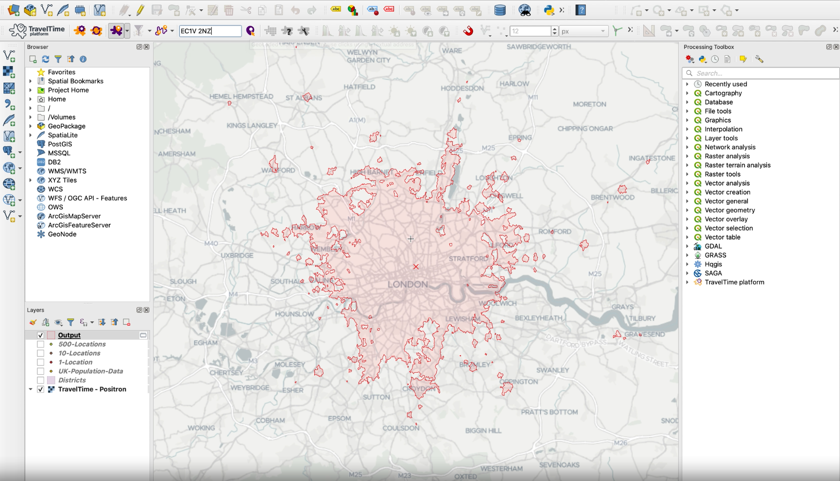Here’s just a taste of what you can do with the TravelTime plugin’s isochrone tool: