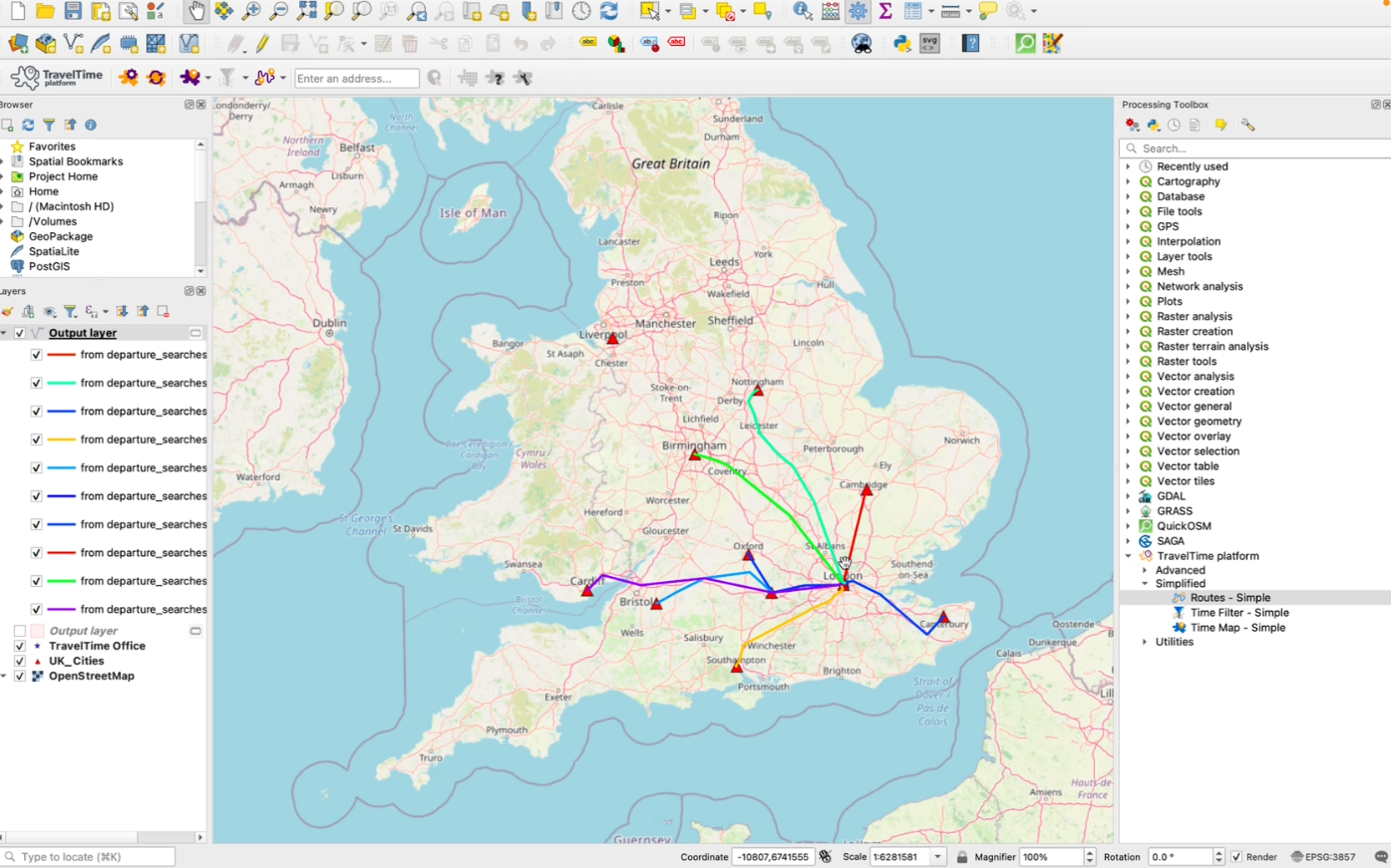 You can use this within your geospatial analysis to determine where to locate new facilities, for urban transport planning and much more. The plugin also offers additional tools – the ability to calculate travel times between thousands of destinations and route planning functionality.